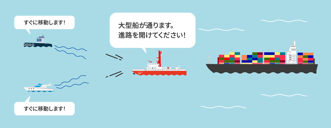 巨大船や危険物積載船は、急に止まったり、針路を急変することが容易ではないため、巨大船の航路を確保すべく、周囲を航行する他船や水先人と連絡を取りながら、安全に入出港できるように巨大船を先導する船舶のことです。