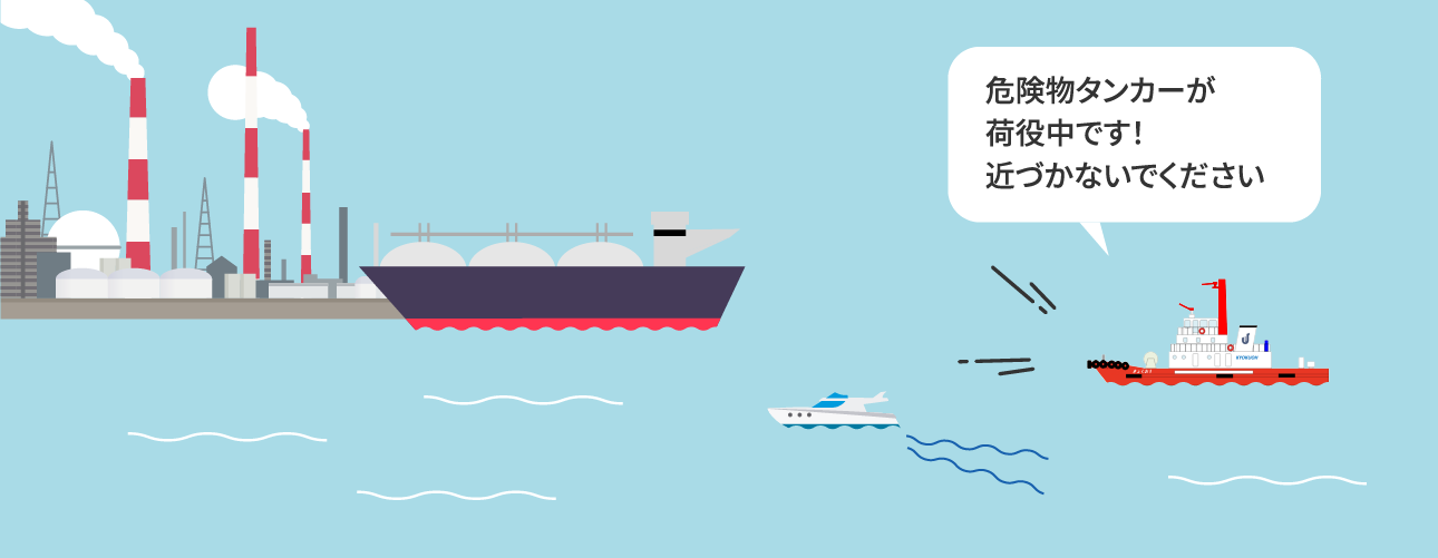 危険物積載船(LNG、LPG、原油等)が荷役する際、他船が本船や荷役施設に接近しないように警戒する船舶のことです。流出油事故や火災事故が発生した際には、防除作業および消火作業を行います。また有事の際、タグボートの支援が間に合わないようなときは、警戒船にて本船の曳航を対応します。